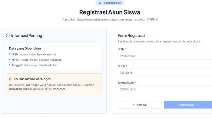 Untuk siswa luar negeri yang berasal dari sekolah non SRI (Sekolah Rakyat Indonesia) bisa menggunakan NPSN 69999999. Untuk melakukan registrasi siapkan NISN, NPSN, dan tanggal lahir.
